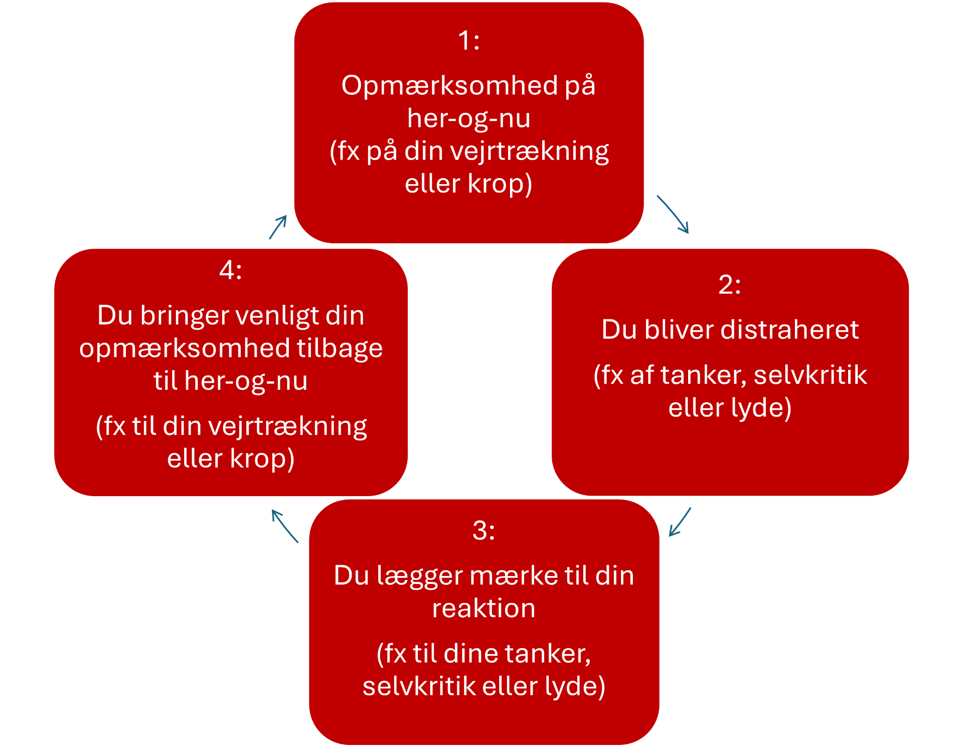 Mindfulness reducerer en lang række tilstande, såsom stress, angst og depression, og fremmer trivsel generelt. Mindfulness betyder, at du bevidst forsøger at vende opmærksomheden imod her-og-nu uden at dømme, hvad du end mærker. Det er altså en slags nærværstræning. Du kan også bruge lydfilerne før og efter en EMDR bearbejdning. Processen kræver træning, og den foregår ofte i fire trin, som du kan se på billedet nedenfor: